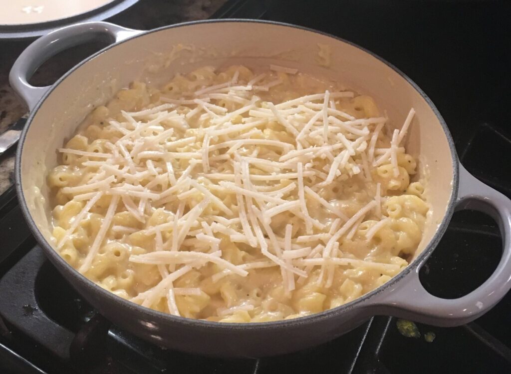 Once the pasta is cooked and drained, you’ll take the thickened roux and pour it over the pasta. At this point, add your cheese and then mix all the ingredients together. Pour your Mac n’ Cheese mixture into a 9×13 pan or some sort of similarly sized casserole dish and top it with the additional Daiya cheese shreds.
