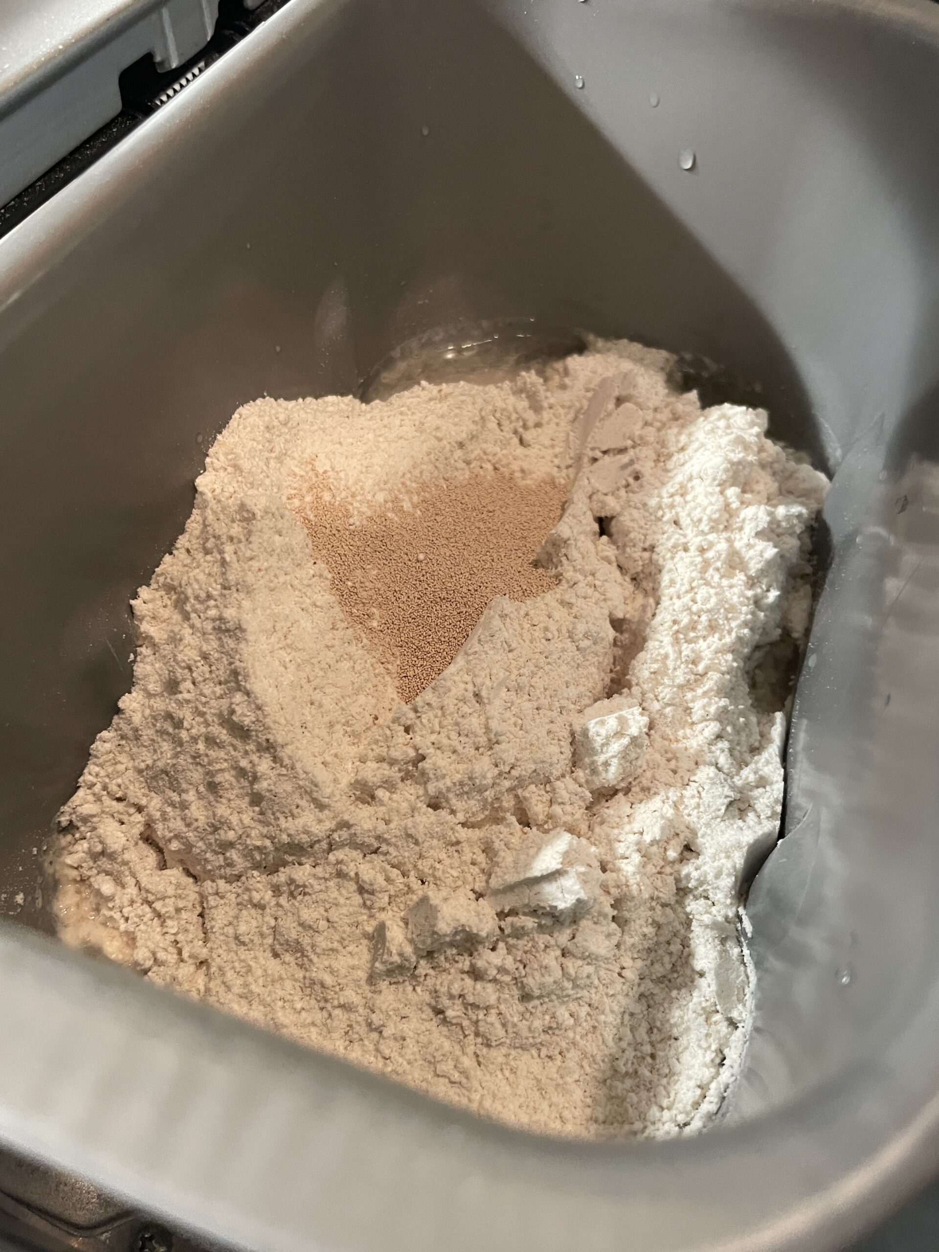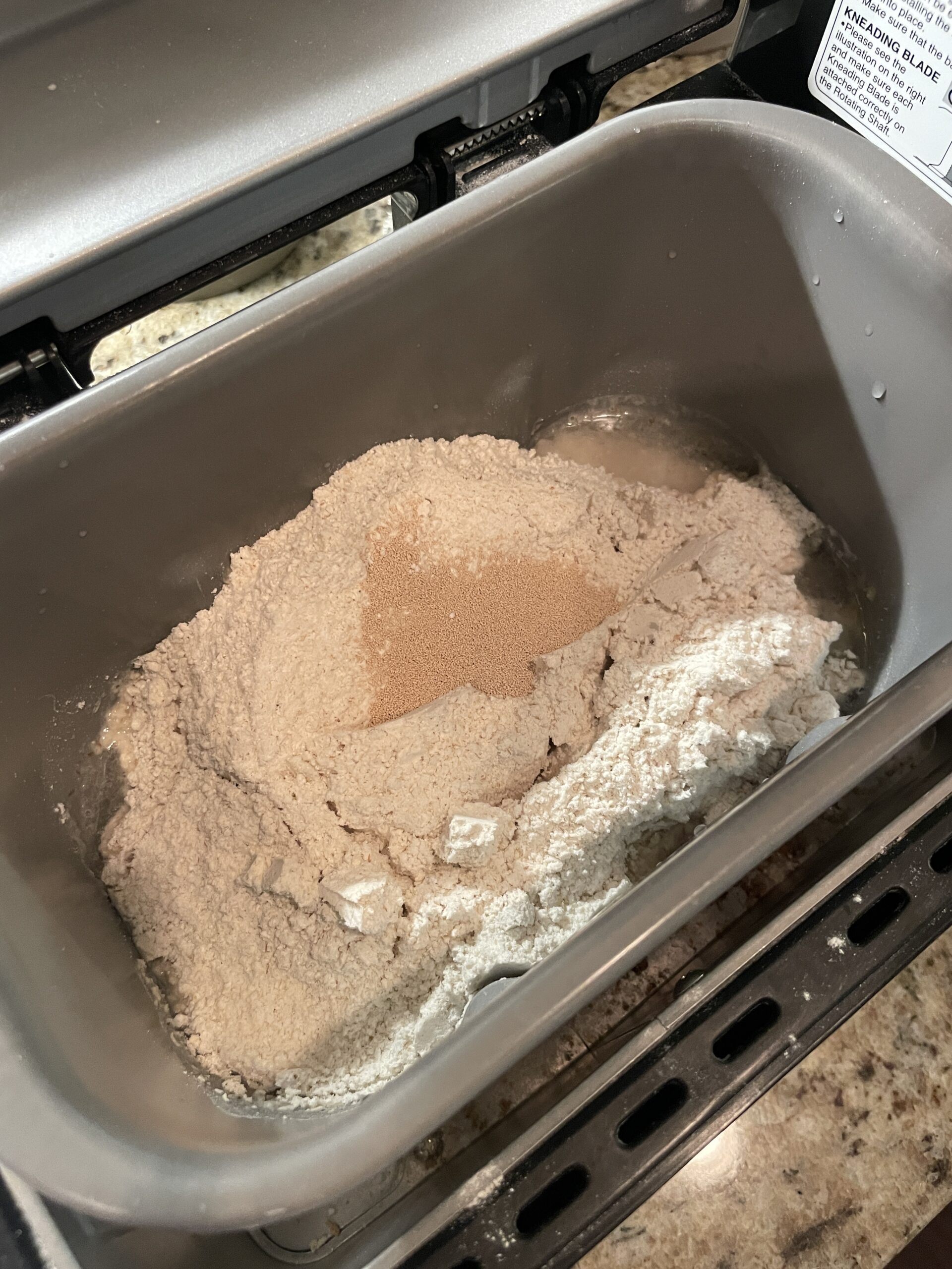 - While the bread machine is warming up go ahead and start adding the ingredients in the order listed on the recipe (wet ingredients first – on the bottom (with the exception of the salt and sugar) then dry ingredients last – on the top)