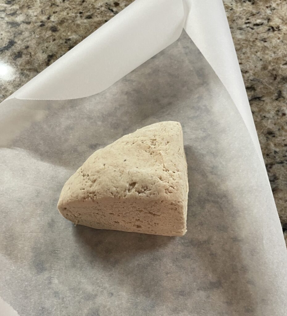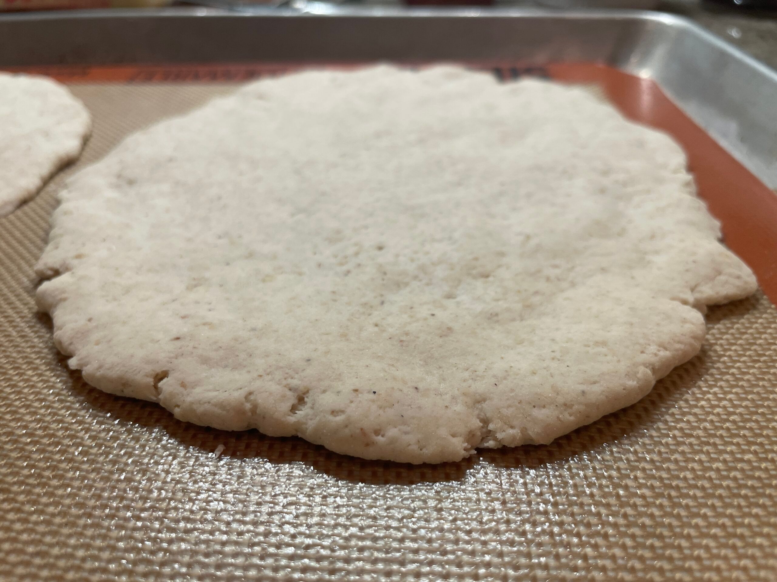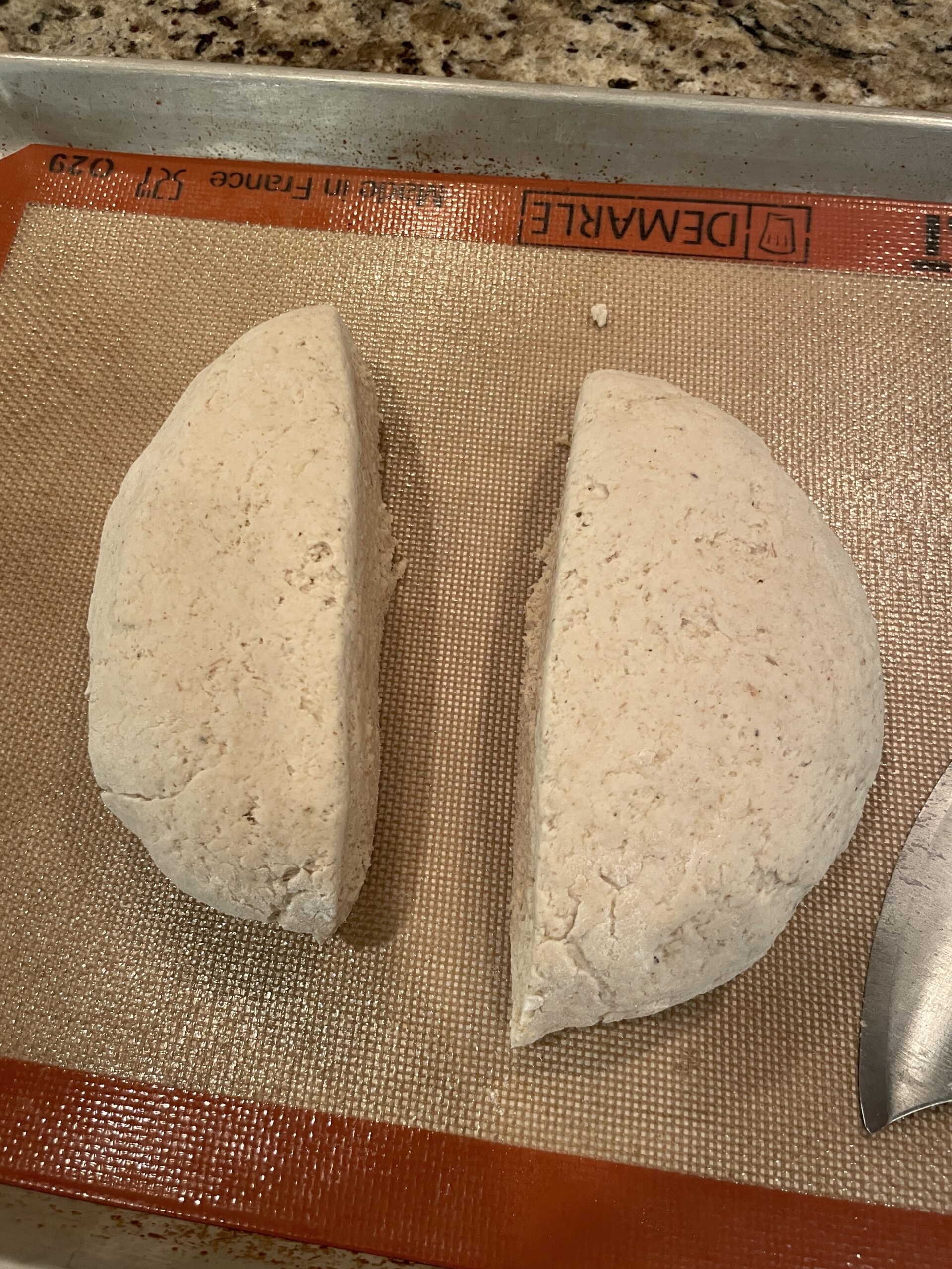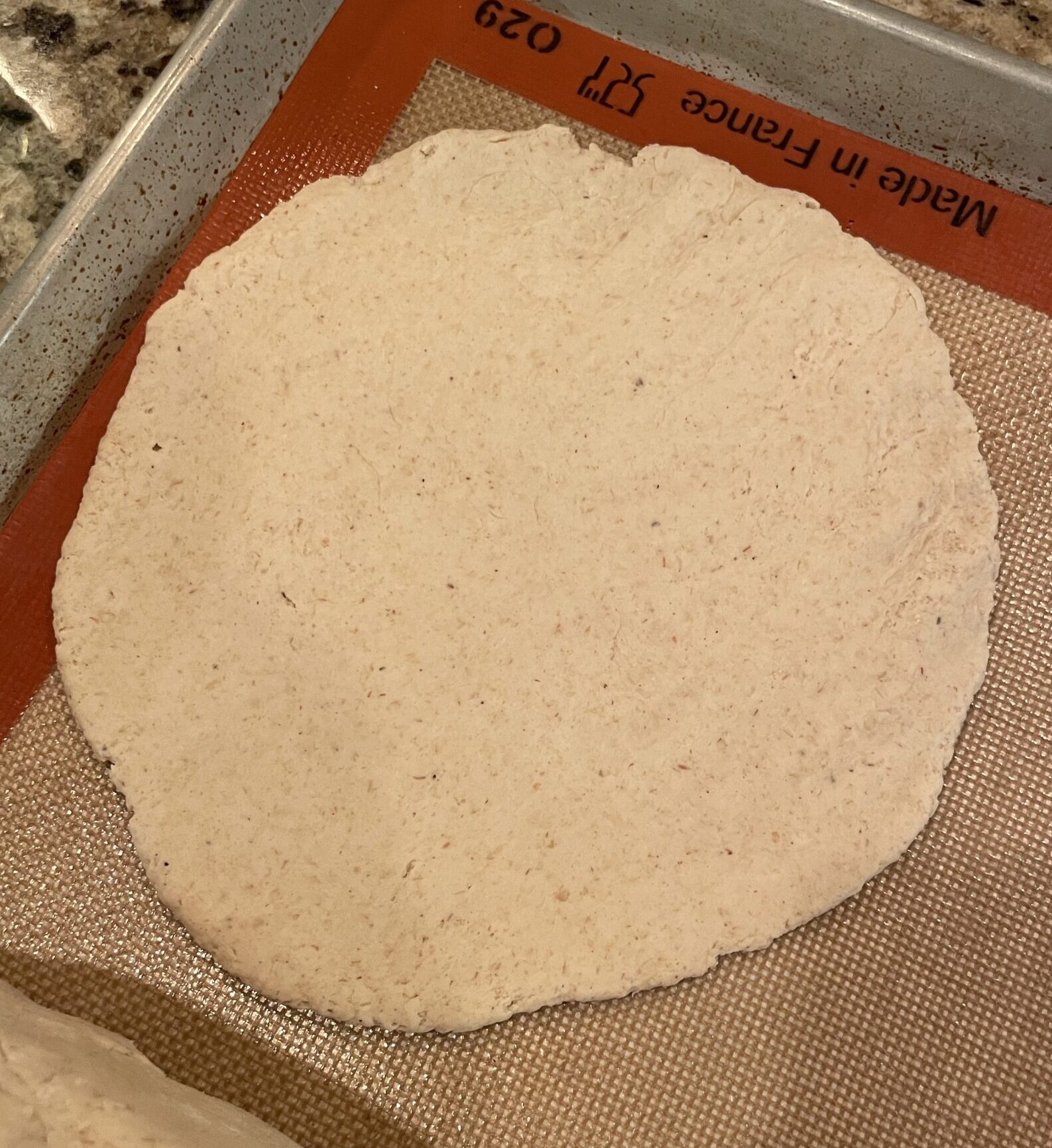 - When your dough is ready, turn the dough out onto your sheet pan and form a circle. Cut the dough into fourths. You can use all sections or you can wrap some up and put them in the freezer for later.