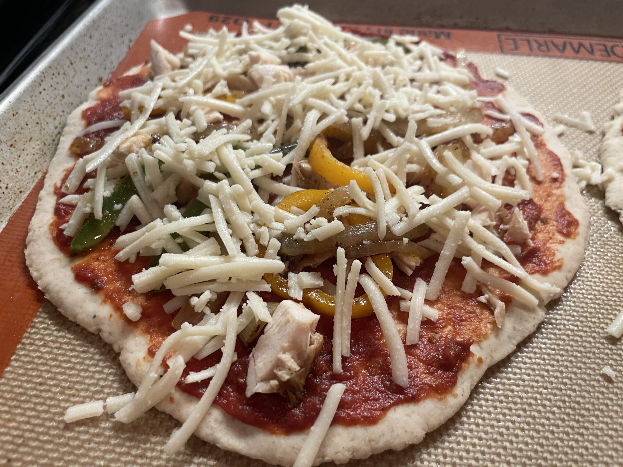 This is where you can get creative and personalize your pizza. I often will go through and see what left over meat we have or vegetables we have on hand, etc. before deciding if I need to make other things. For instance, taco meat left from Taco Tuesday, smoked chicken or smoked sausage. If we do, I just dice it up in small pieces and add it as a topping to our pizzas.