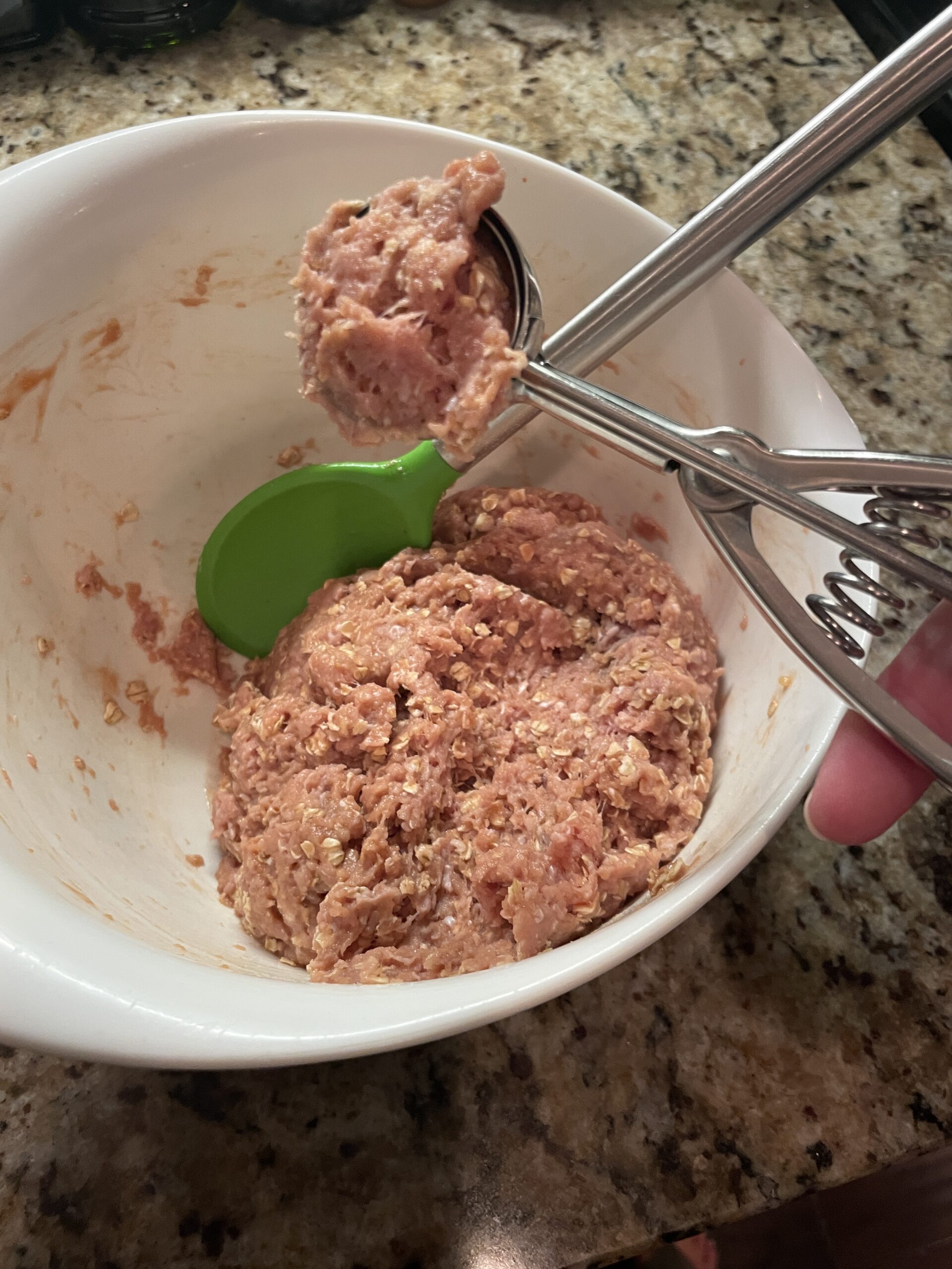- In the mixing bowl, you will combine all ingredients and mix well. Make sure everything is well incorporated including the egg. Spray your sheet pan with non-stick cooking spray or add a non-stick sheet pan liner. Using the large cookie scoop you will begin scooping meatballs and placing them on the sheet pan about 1 inch apart. These will not spread but will release a bit of liquid as they cook.