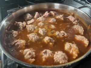 4. Bring the sauce to a simmer and let simmer for 10 minutes on low heat. This will allow the sauce to thicken some. During this time you can mix the meatballs if you haven’t already.