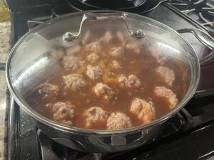 5. After simmering for 10 minutes, use a cookie scoop or spoon to scoop the meatball mixture into the sauce. (Check the blog post for pics) Using a tight fitting lid, cover and simmer for 15 to 20 minutes or until the meatballs are no longer pink.